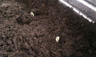Anywhoo--I planted them on Mon Feb. 21st. The pack said it takes about 10-14 days until germination so I wasn't expecting much for about 2 weeks. Well yesterday I noticed 2 seeds have already sprouted and one more is just getting ready to break the surface. I am so stoked!